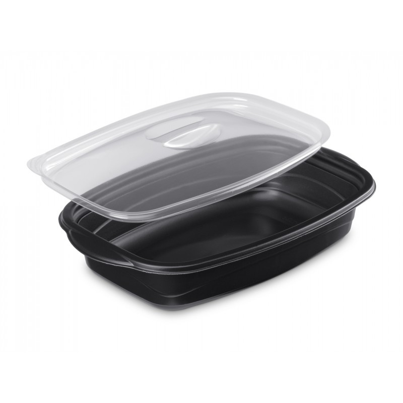 Barquette marmiton noire micro-ondable et son couvercle transparent traité anti-buée.