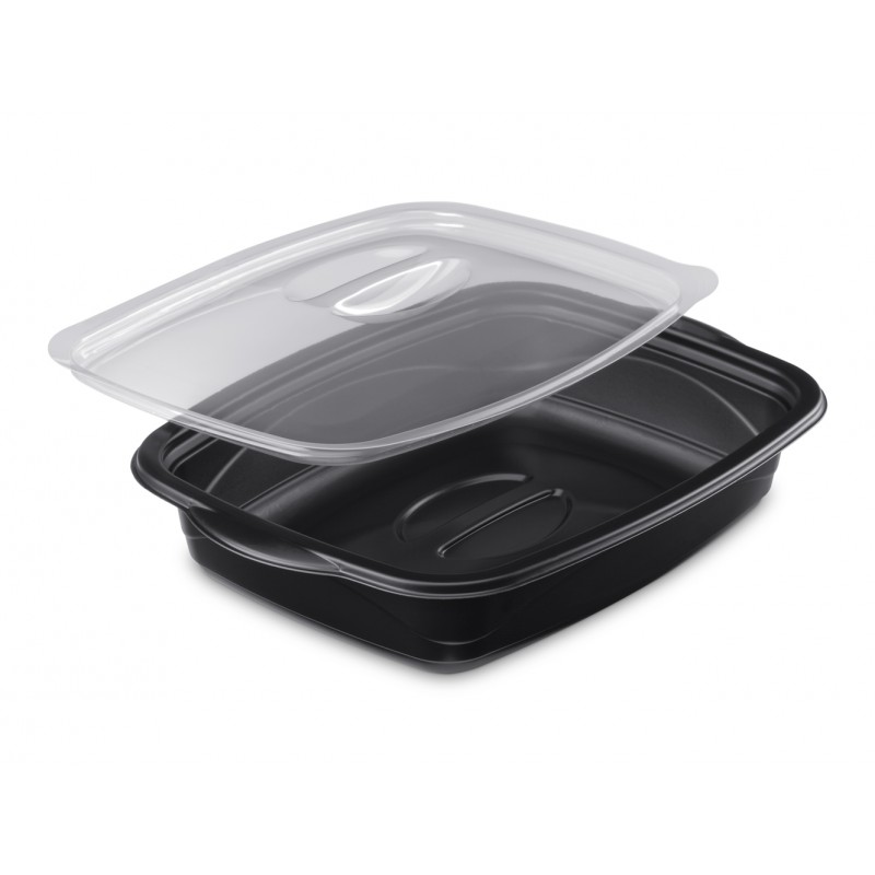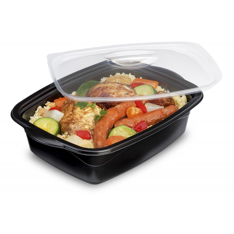 Barquette marmiton noire micro-ondable et son couvercle transparent traité anti-buée.